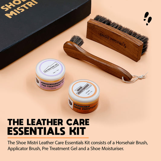 Leather Care Essentials | Pamper your leatherSaleShoe Mistri Leather Care Essentials Kit Drawer | Pack Of Leather Moisturiser, Pre-treatment Gel, Horse Hair Curved Brush with Soft Applicator Brush
