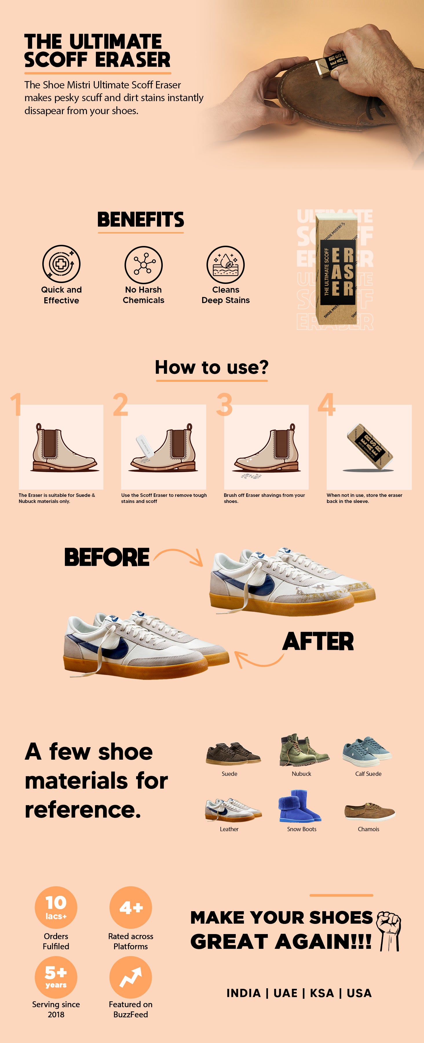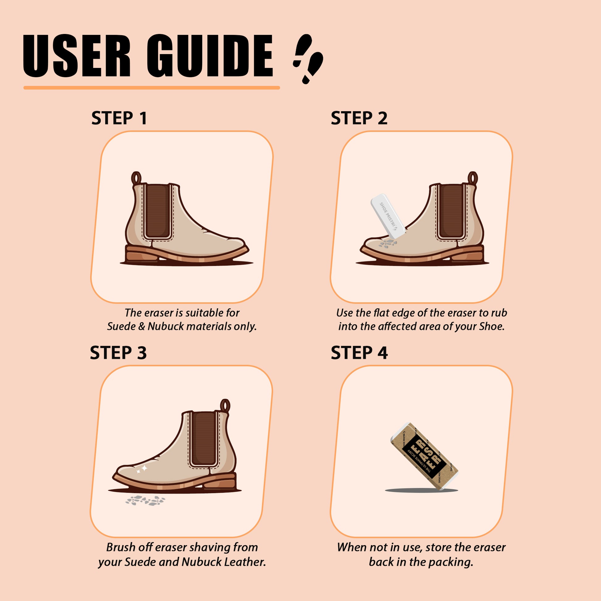 - EASY-TO-USE: Simply rub & scrub the eraser gently over the affected area, then brush off the remaining particles with Shoe Mistri suede brush afterward. This suede eraser is safe to use on multiple surfaces and will not change the colour of your shoes.