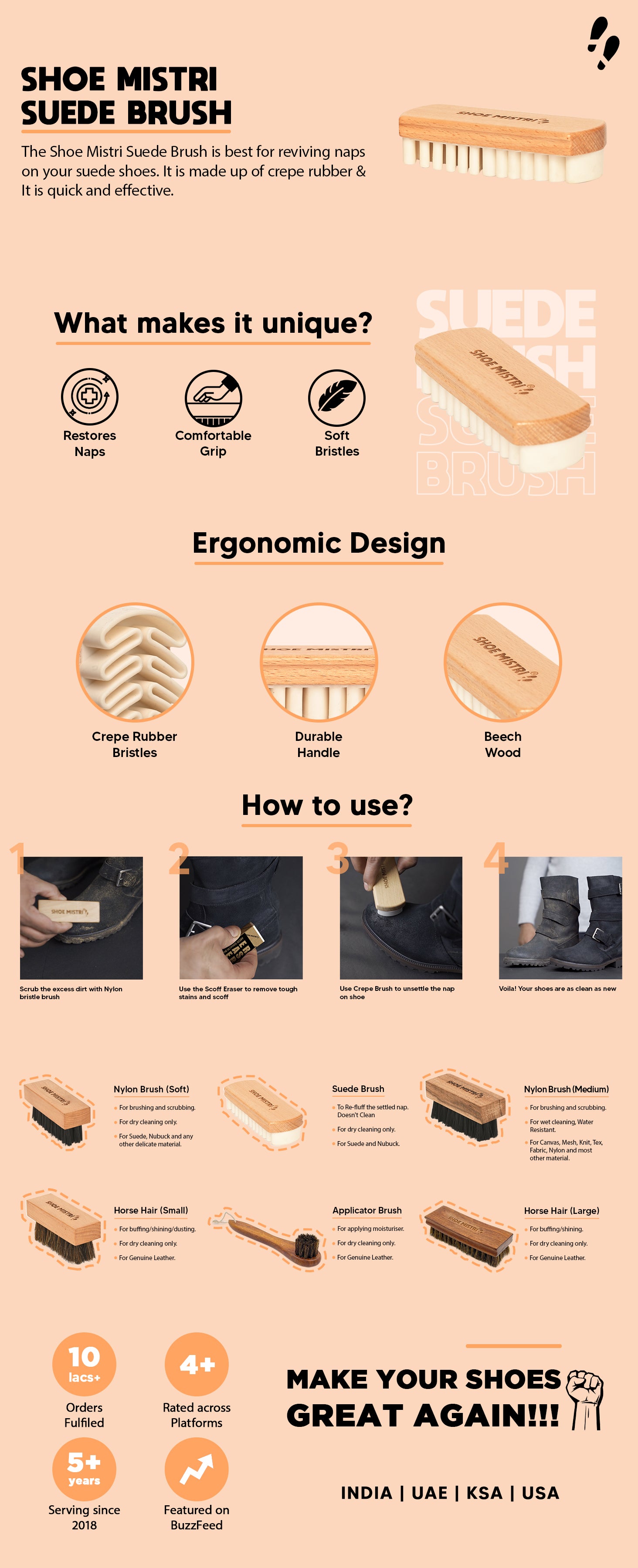 - NATURAL WOOD BASE: The Shoe Mistri Crepe Brush has an extra durable, handmade wood handle that is made to exactly fit your hand for the ultimate cleaning results.