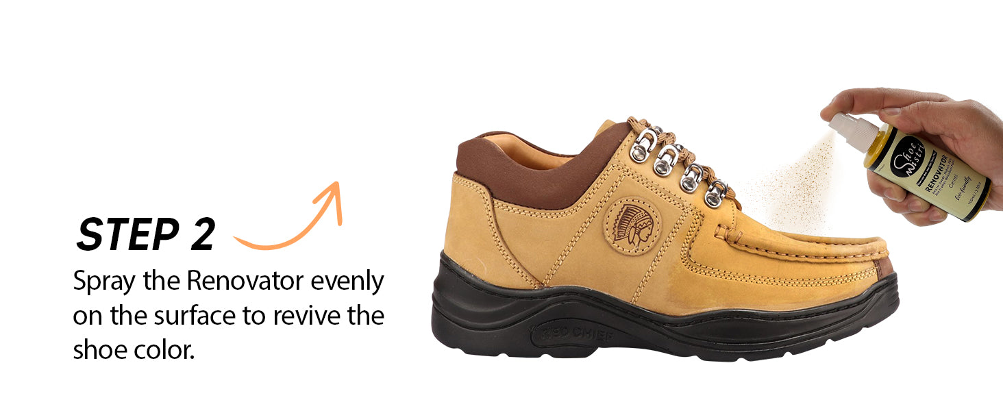 Shoe Mistri's Renovator(Camel) is convenient, Non-Toxic and Eco-Friendly water based spray. It removes stains and restores the original colour of the shoes. It is suitable for only Camel colour suedes, nubucks, canvas and other absorbent fabrics. Generally, it requires 7-9 sprays on one shoe. However, the no. of sprays varies depending on the porousness of the fabric.