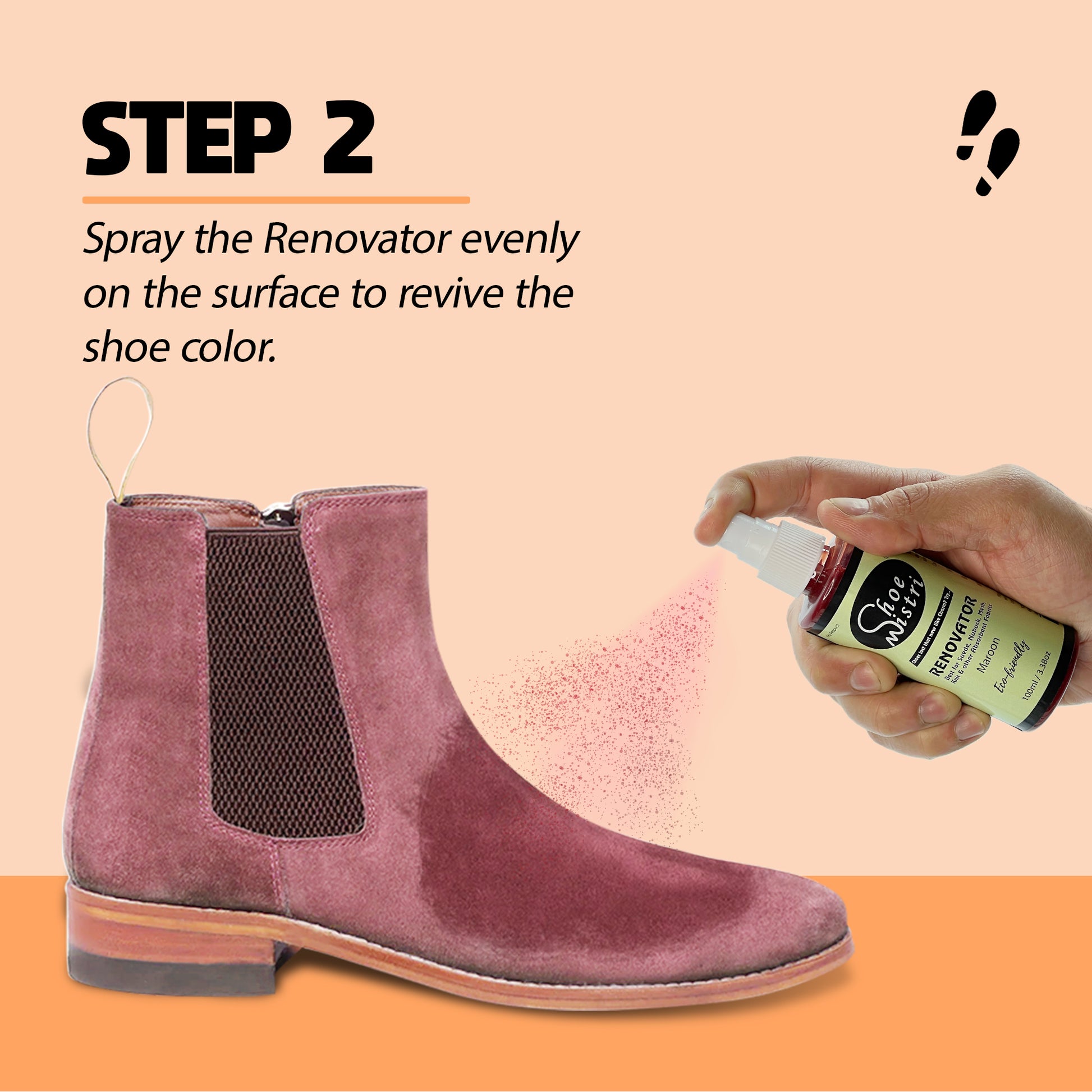 Shoe Mistri's Shoe Renovator (Maroor) is a revolutionary water-based spray - convenient, non-toxic, and Natural. Now, available in Indian market. It is not just an ordinary polish. It is a classic Renovator spray made of rich nourishing ingredients that build a coating, revive the original colour of your old, dull, and dead shoes to make them look new.