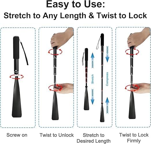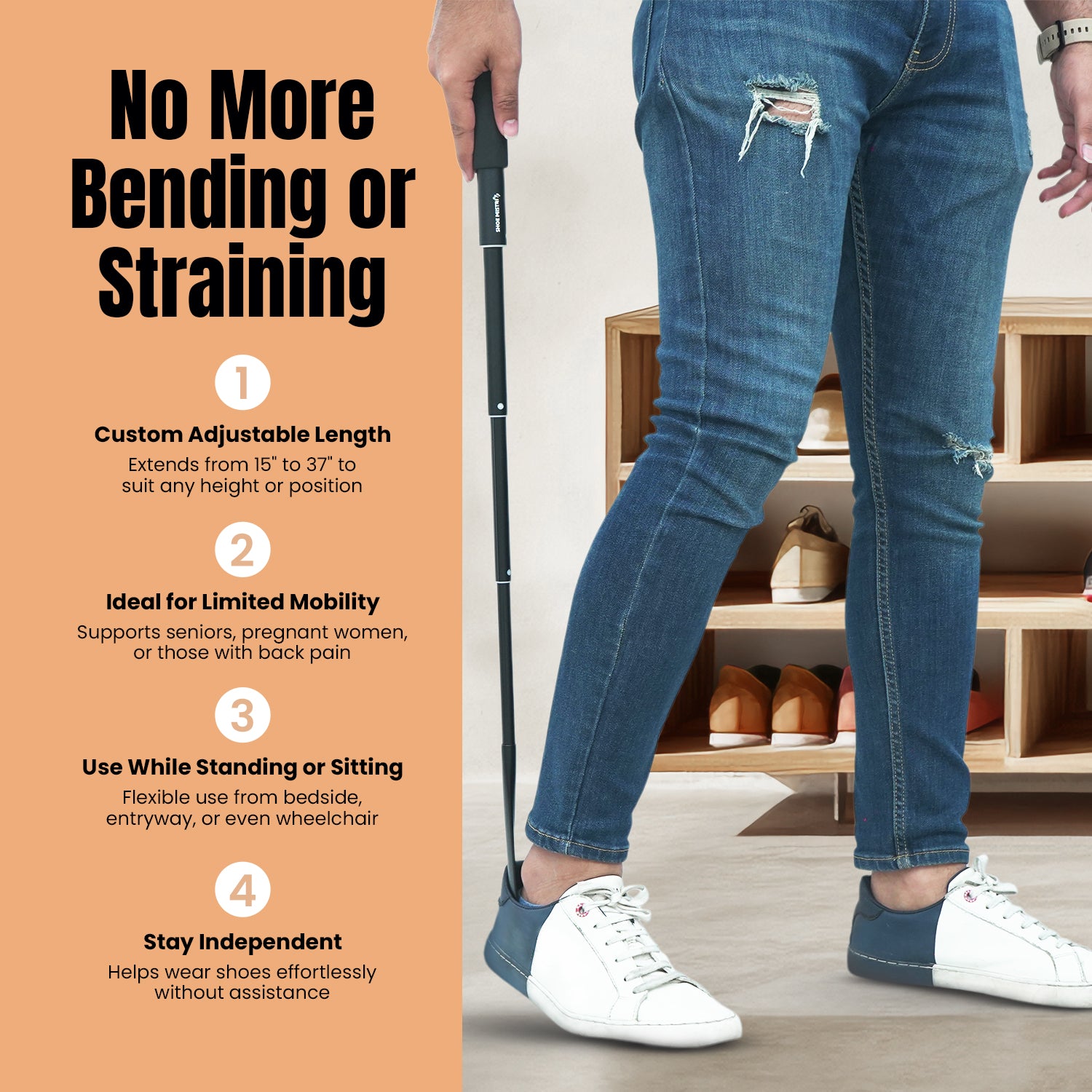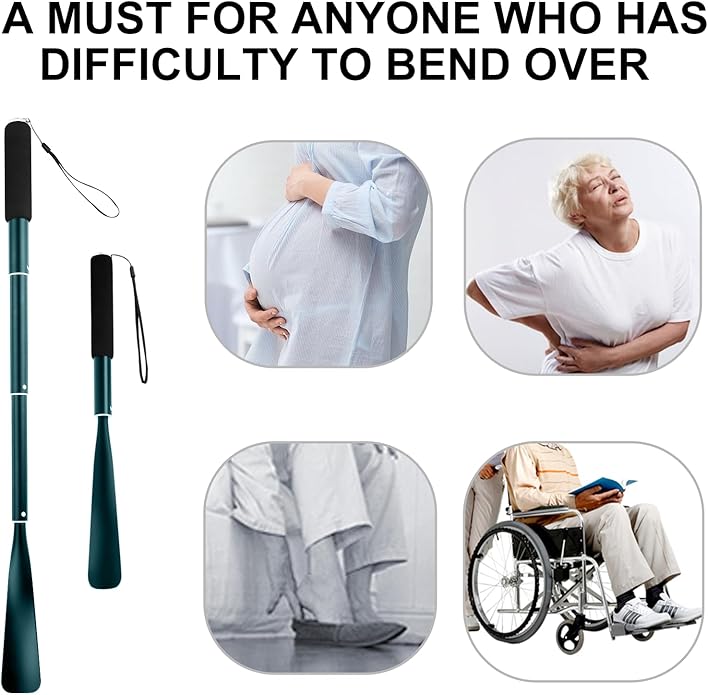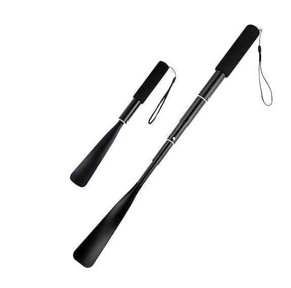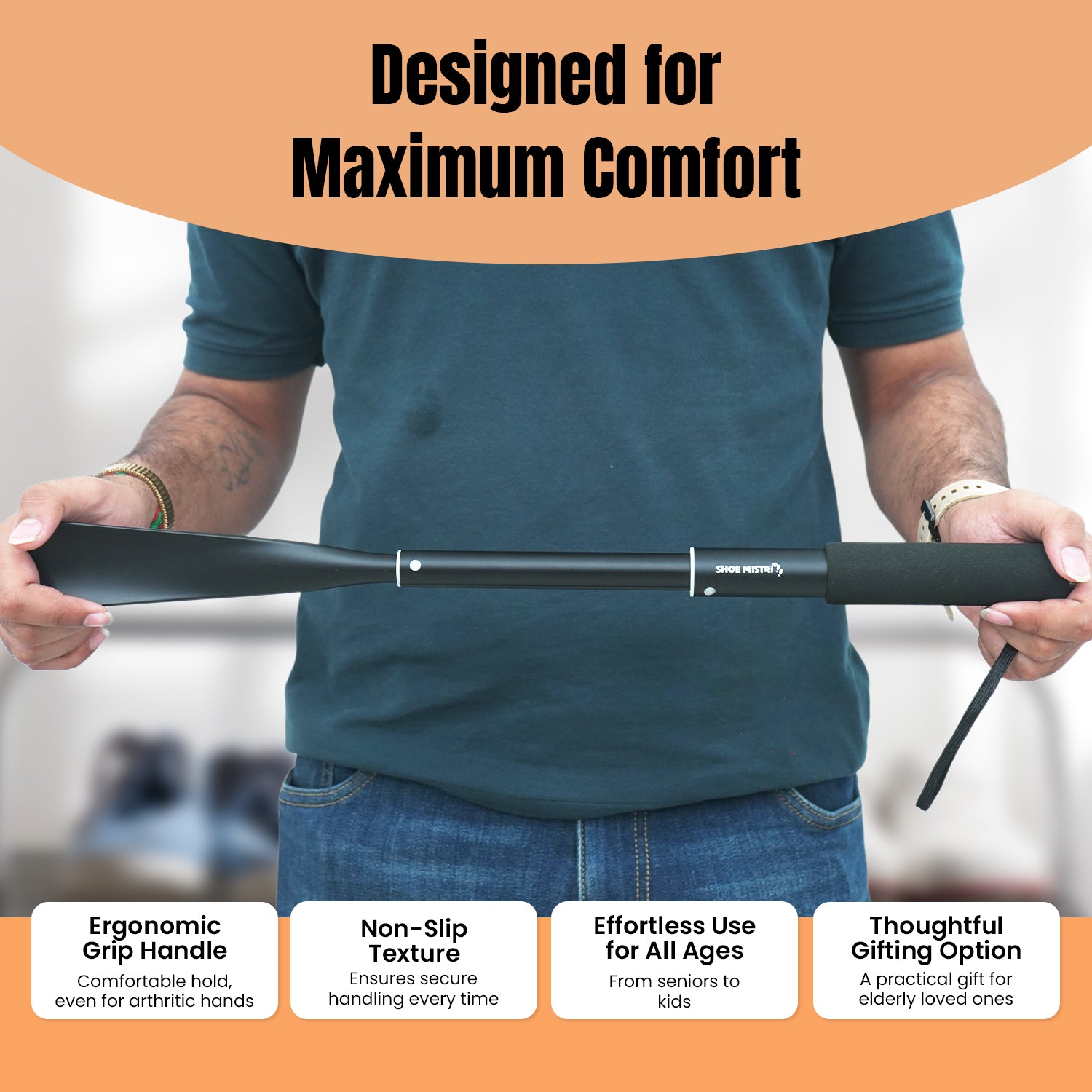 - The length of this shoehorn will enable you to put on your shoes without having to bend over.
